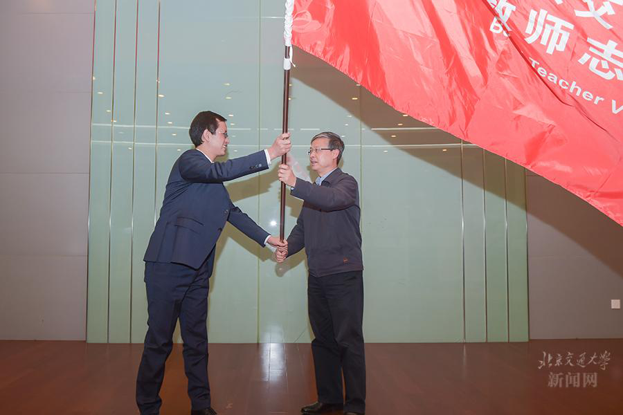 教师志愿者代表蔡国庆从黄泰岩手中接过团旗并发言。他表示,教师志愿者将遵循习近平总书记关于志愿服务的重要指示精神,在服务学生、服务学校和服务社会中彰显大学教师的使命,为学生成长、学校发展和社会进步作出新的贡献。