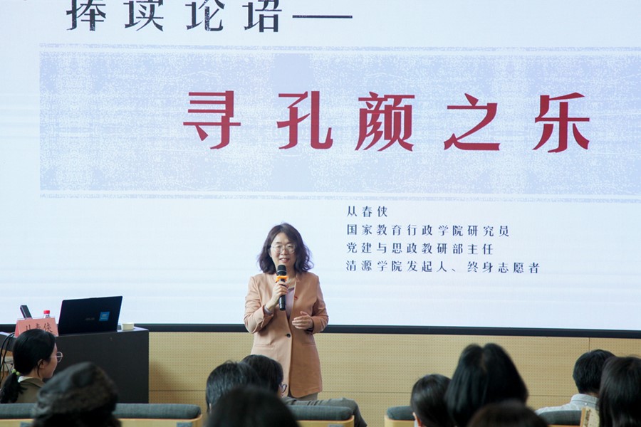 从春侠教授以《读<论语>,寻孔颜之乐》为题,从“何谓孔颜之乐、孔颜之乐,所乐为何、寻找当下的孔颜之乐”三方面进行讲解,阐释了孔颜之乐“乐在学中,乐在道中,乐在教中,乐在心安。”并提出高校教师要读原文,悟原理,深悟笃行,汲取圣人生命智慧和能量,向上向善,感悟传道授业解惑中收获的“为师之乐”。